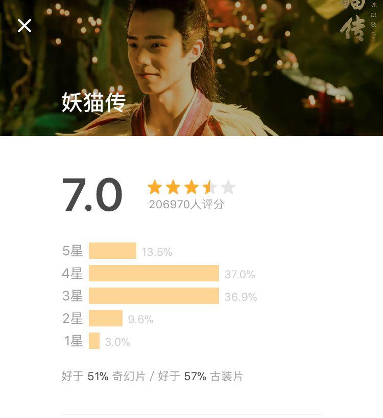 然而几天后《妖猫传》口碑出现了逆袭。随着《妖猫传》的热映,电影口碑开始发酵,豆瓣评论人数增至20万,豆瓣评分从6.8分增至7.0分,五星好评人数占到了13.5%,四星、三星人数则达到了73.9%——在文艺青年聚集的豆瓣上,这种口碑逆袭是罕见的。