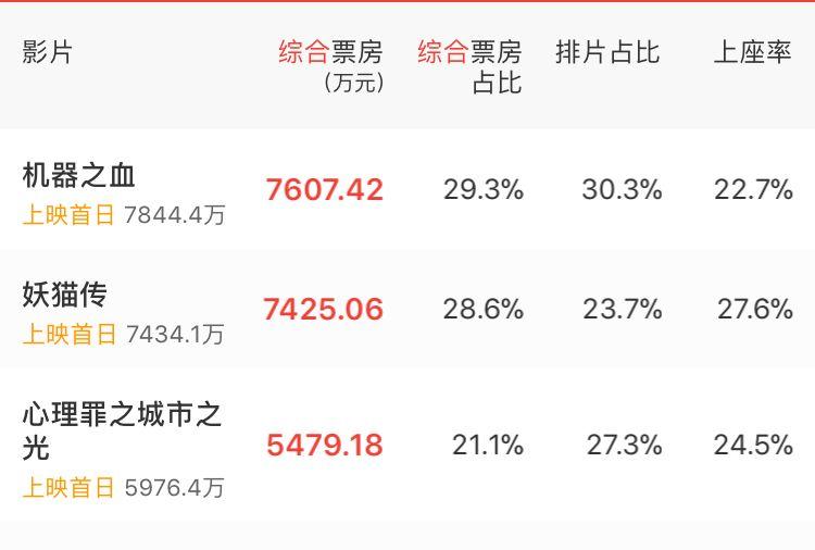 可在电影上映初期,《妖猫传》的形势并不被看好。12月22日《妖猫传》上映首日,排片占比为23.7%,同期《城市之光》排片量占比27.8%,《机器之血》则达到30.3%,但《妖猫传》影片上座率却达到了27.6%,位居第一。即便排片不占优势,《妖猫传》首日票房达到7383.9万。超过《心理罪之城市之光》的5473万票房。