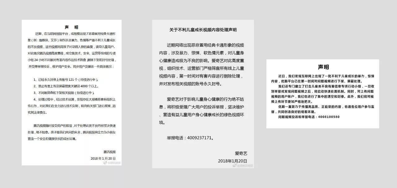 现在,由于大量网友举报,优酷、爱奇艺、腾讯视频等视频网站已经在其平台上删除了大量涉事视频。但是考虑到这些视频内容很多已经上传了数个月甚至数年,某些内容的播放量甚至已经达到了数百万,到底有多少中国的小朋友看过这些视频,实在是无法统计。