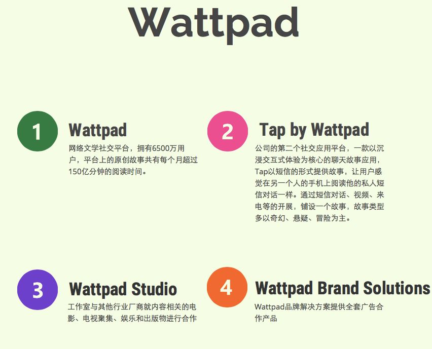 公司目前以Wattpad平台为主要业务,另有内容合作工作室和品牌合作部门。