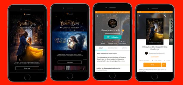 又例如,Wattpad与迪士尼合作进行了新电影《美女与野兽》在平台上的推广,在电影发行的前两周,Wattpad通过举行“美女与野兽”的写作挑战赛,让用户提交原创故事,讲述他们对内在美的解读,另有平台大V来进行引导。