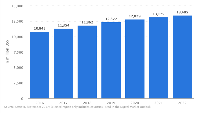 根据Statistia的统计,全球电子书阅读市场2017年规模约为114亿美元,预计2018年将达到119亿美元,年增幅约为4.5%。