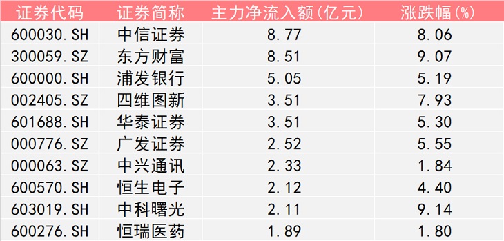 个股资金数据显示,剔除尚未开板的新股,今日共计38只个股的主力净流入额超过1亿元。在主力净流入额居前十的个股中,券商股表现出众,中信证券(600030.SH)、东方财富(300059.SZ)、华泰证券(601688.SH)、广发证券(000776.SZ)主力净流入额分别为8.77亿元、8.51亿元、3.51亿元、2.52亿元。此外,低估值的文化传媒股也获得主力资金大力追捧。顺网科技(300113.SZ)、暴风集团(300431.SZ)、华谊兄弟(300027.SZ)、掌趣科技(300315.SZ)在获得逾亿元主力资金净流入之时,股价也大涨。其中,顺网科技、暴风集团涨停。