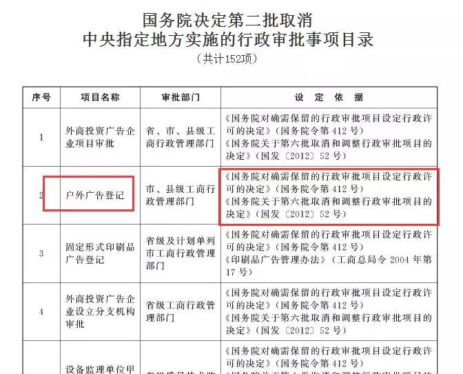 但是,小彬查阅资料后发现,这些说法并不准确,2016年2月19日国务院公布了《关于第二批取消152项中央指定地方实施行政审批事项的决定》,这项决定中明确规定:取消原属市、县级工商行政管理部门(市场监督管理部门)实施的户外广告登记行政审批事。
