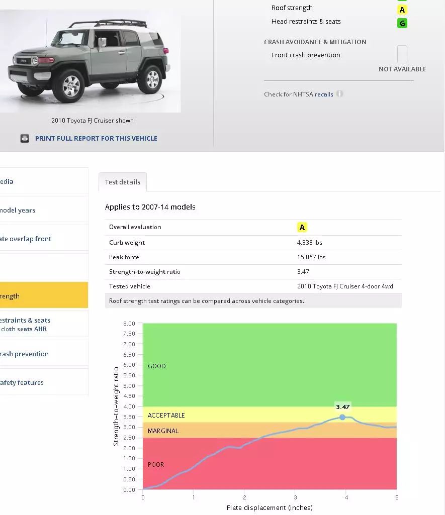 但是车顶强度不足以抵御过重的底盘,在翻车中这个问题就被突出了,很多非承载车身在IIHS的车顶强度测试中表现并不是优秀水准,在承载车身SUV能够承受4倍车身重量的成绩下,像是丰田FJ这类很粗犷、很结实的非承载车型,只能承受3.47倍。
