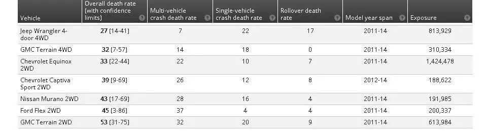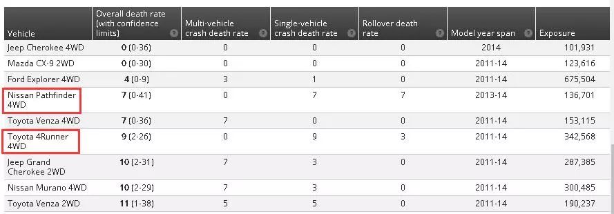 到了2014年,死亡率最低的中大型SUV里,只有2款非承载车身,其余都是承载式车身的SUV。
