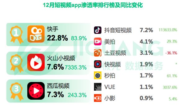 根据极光大数据的统计结果,截至去年12月,在短视频领域中渗透率排名第一的是快手。报告数据显示,快手截至12月最后一周的用户渗透率达到22.8%,活跃用户数为9,500万,显著高于其它同类别应用。