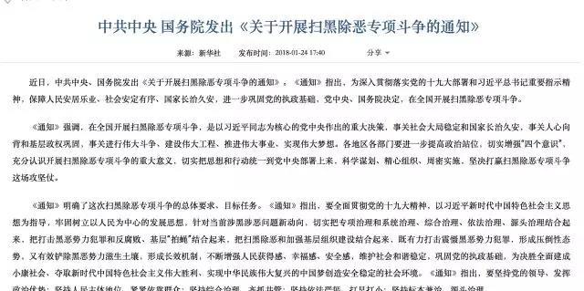 今年的腊八节,中央给全国人民送上了一份很特别的“节日礼物”:中共中央、国务院决定,在全国开展扫黑除恶专项斗争。