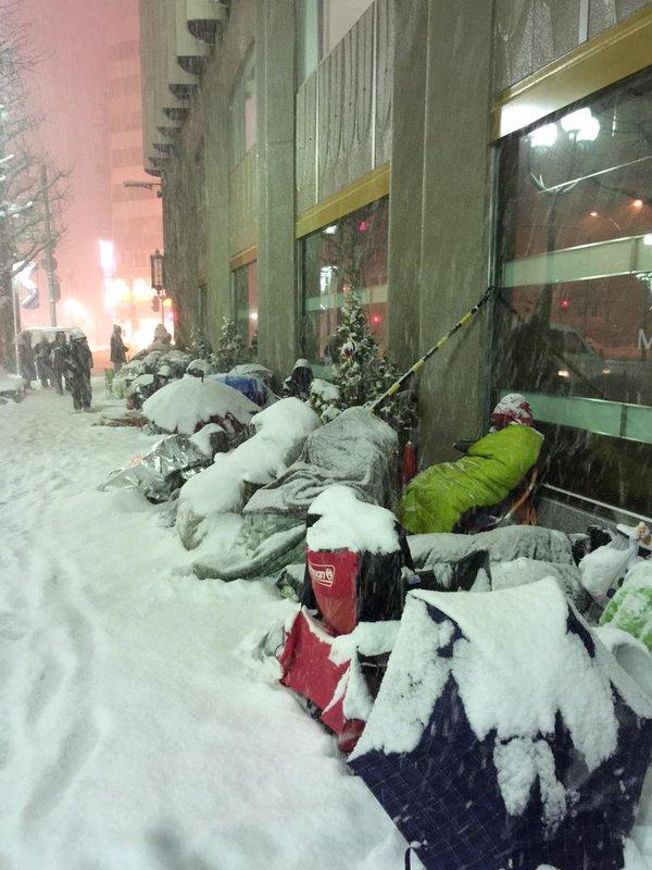 人们在等待每年1月2日早上8点开始发售的日本苹果店“福袋”。排队者都是一副持久战的架势,几乎每个人都都带着折叠凳、过夜棉被、干粮甚至取暖的火炉。札幌苹果店外的这一幕会更戏剧化,在北海道的鹅毛大雪中,店外裹着露营袋、头顶积满了雪,静静等待的人群简直像雕塑一般。但没有人在这时放弃。