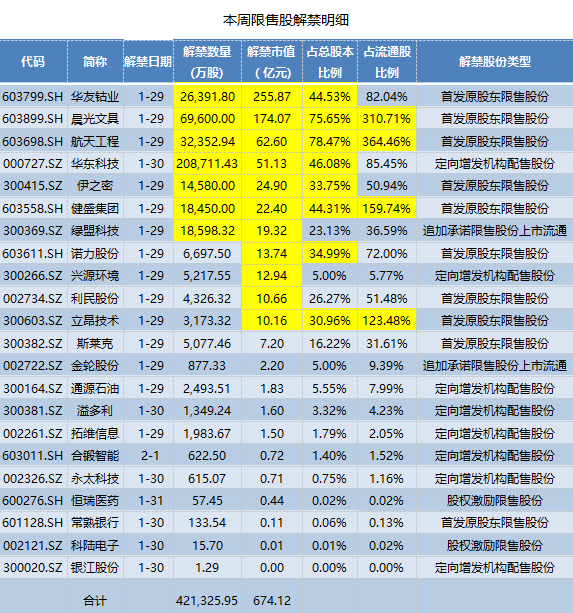 本周解禁集中在1月29日。本周1月31日和2月1日各仅有1家公司解禁,2月2日没有公司解禁。