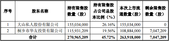 有色板块的华友钴业是本周限售解禁市值最大公司。根据公告,公司1月29日有2.64亿股限售股上市流通,占公司总股本的比例44.53%,为首发限售股解禁。解禁涉及股东共两家,分别是大山私人股份有限公司和桐乡市华友投资有限公司。