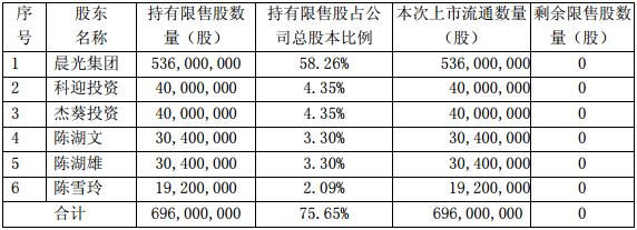 此次解禁涉及的股东6家,其中,晨光集团为控股股东,科迎投资和杰葵投资为公司高管人员以及业务骨干持股,陈湖文、陈湖雄及陈雪玲三位自然人为三姐弟,为公司实际控制人。