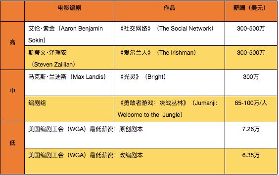 按照美国编剧工会(WGA)的标准,一部原创电影剧本的出价不得低于7.26万美元,一部改编剧本的出价不得低于6.35万美元,比起少数“金牌编剧”一部剧本薪酬可达到300-500万,大部分编剧一部电影剧本的总收入都是低于50万的。