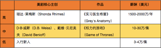 而按季签约的电视剧集编剧平均每集片酬1.5万美元,当然,除非他/她同时也是核心主创人员,那收入就相当可观了。核心主创被称为是一部美剧的核心人物,需要从编写剧本到制片各个环节层层把关,这也就不难解释美剧《实习医生格蕾》的主创珊达 莱梅斯为何每年能拿1500万美元的高薪了。