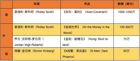 相比知名商业大片导演500-1000万,甚至1000万以上的片酬,大部分非著名导演或非商业大片导演的片酬相对要低很多,并且,如果是新人导演,哪怕执导的是商业大片,片酬也相对较低。著名导演雷德利 斯科特(Ridley Scott)执导《异形:契约》(Alien:Covenant)的片酬是1000万至1200万美元,而他执导更个人化的犯罪片《金钱世界》(All the Money in the World)片酬则介于100万美元至300万美元之间。