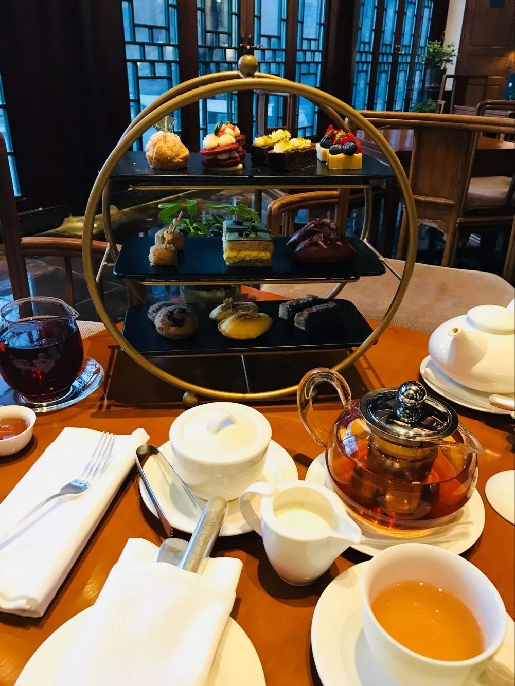 与“赏悦亭”一池之隔的镜影轩酒廊面对着迷人的莲池景观,古典与优雅完美碰撞,是我尚未打卡前就心心念念的一处场地,于是毫无犹豫预订了下午茶。