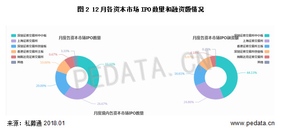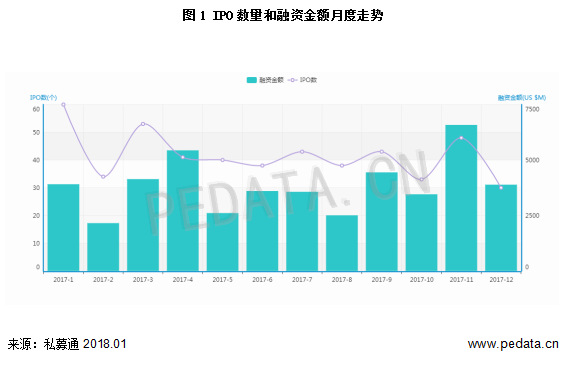 根据清科研究中心旗下私募通数据显示,2017年12月全球共有30家中国企业完成IPO,IPO数量环比减少37.5%,同比减少43.4%。中企IPO总融资额为38.89亿美元,融资额环比减少40.9%,同比减少33.9%。本月完成IPO的中企涉及13个一级行业,登陆6个交易市场,中企IPO平均融资额为1.30亿美元,单笔最高融资额6.68亿美元,最低融资额646.16万美元。