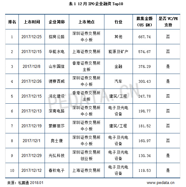 30家IPO企业中14家企业有VC/PE支持,占比43.3%。新一届发审委自去年10月下旬正式履职以来,IPO审核标准从严,使得部分拟上市企业未能成功上市,导致12月份上市中企数量和融资额双双下降。本月金额最大的三起IPO案例为:招商公路上市(6.68亿美元),华能水电上市(5.75亿美元),山东国信上市(3.78亿美元)。