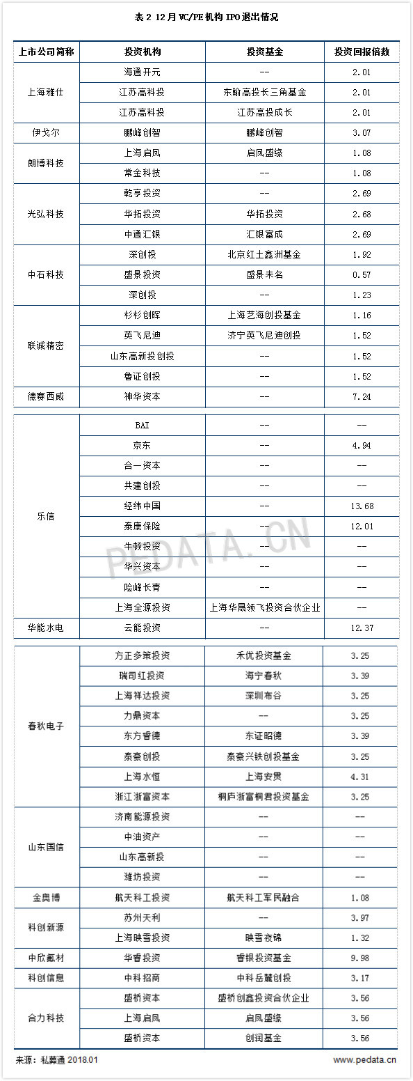 根据清科私募通数据统计:2017年12月,30家IPO企业中14家企业有VC/PE支持,占比46.7%。IPO退出共19起,涉及机构45家,25支基金。本月IPO退出数量同比下降40.6%,环比下降29.6%。与其形成鲜明对比的是,以发行价计算,2017年12月IPO退出平均回报倍数为3.69倍,仅次于11月份的3.92。其中,乐信、中欣氟材、华能水电的投资方在被投企业上市当日获得约10倍及以上的回报,提升了市场整体的回报倍数。