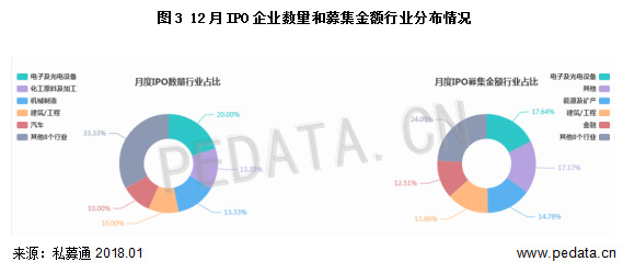 根据清科私募通数据统计:12月中企IPO共涉及13个一级行业,从案例数来看,电子及光电设备、化工原料及加工、机械制造分列前三位,分别完成6、4和4个案例;分别占比20.0%、13.3%和13.3%;累计占比46.7%。金额方面,电子及光电设备、其他、能源及矿产分列前三位,募集金额分别为6.86亿、6.77亿、5.75亿美元,分别占比17.6%、17.2%、14.8%;累计占比49.6%。