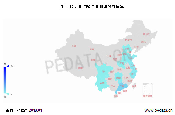 根据清科私募通数据统计:12月中企IPO企业共涉及11个省,从总数来看,广东省、浙江省、江苏省分列前三位,各完成IPO 12、3和3家企业;分别占比40.0%、10.0%和10.0%;其中有VC/PE支持的企业共14家,广东省、浙江省、江苏省分列前三位,中企IPO数量5、2、2家,分别占比35.7%、14.3%、14.3%。