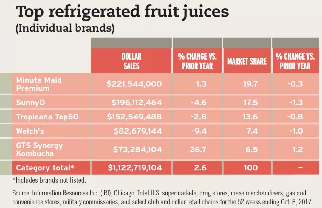 ▲ 美国市场冷藏果汁TOP 5品牌(数据来源:IRI)