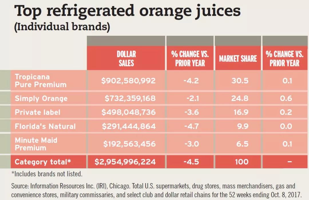 芝加哥市场咨询公司IRI的 数据显示,截止2017年10月8日的52周内,美国超市、药店、大型采购商、加油站和便利店、专卖店以及精选俱乐部和零售连锁店等各个渠道的冷藏橙汁的销售额同比收缩了4.5%,共计超过29.4亿美元的下降。