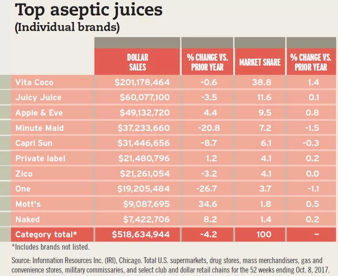 ▲ 美国市场无菌果汁TOP 10品牌(数据来源:IRI)