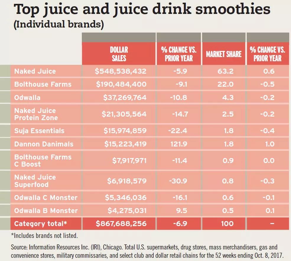 此外,总部位于纽约的百事可乐公司的Naked Juice,在果汁和Smoothie类产品中占有63%的市场份额,排名第一。数据显示,该产品在美国多个销售点的同期累计销售额超过5.48亿美元。