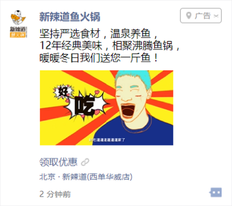 新辣道火锅就在近期的“京城开年贴膘季”,利用朋友圈本地推广广告吸引了不少客流。“暖暖冬日我们送你一斤鱼”这类简单直接的导流文案加之吸睛趣味的卡通视频,引导人们通过微信社交约饭,与其年轻热辣、适合朋友聚会的品牌调性相同。