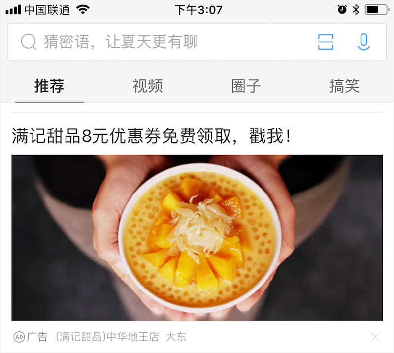 一些餐饮店已经采取用浏览器本地推广广告导流的方式——比如满记甜品。在这类餐饮业态中,到店频率高、单次消费金额低、消费者黏性低、季节影响大是主要特征,因而如何不断招揽新客进店成为满记甜品主要考虑的问题。他们在手机QQ浏览器投放了信息流广告,试图说服消费者“满记甜品不只有芒果、冬天也可以消费”,并用诱人的产品图和促销文案直接吸引客流,达到超过300万次品牌曝光。
