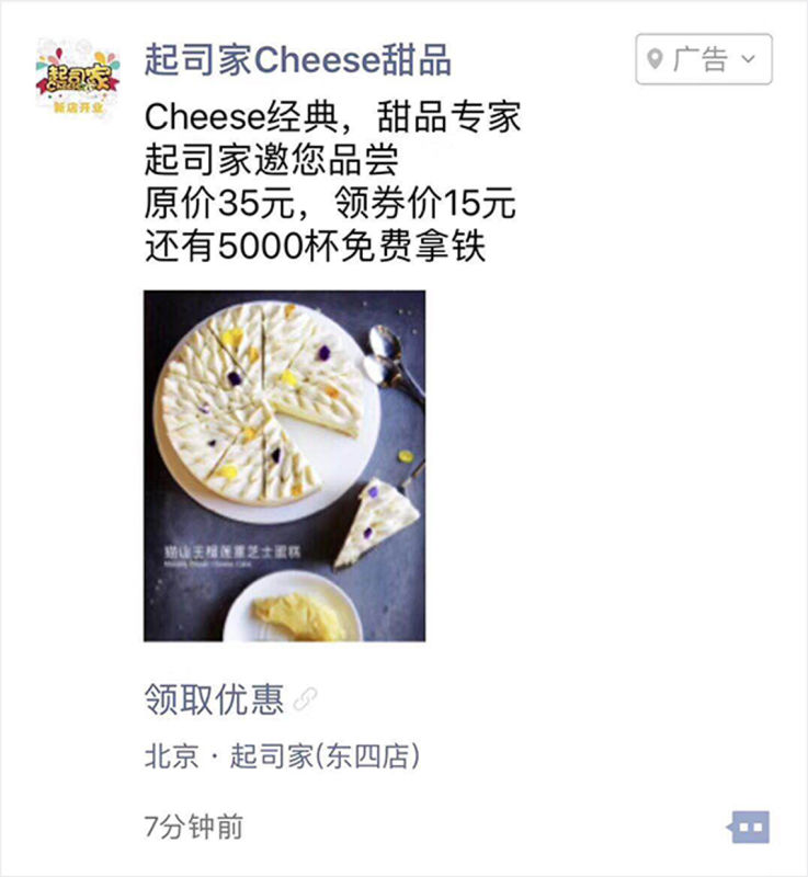 烘焙甜品品牌起司家,则用推送中诱人的芝士蛋糕将喜爱甜品的年轻女性引流至店内消费。这类年龄在16至35岁,对美食餐饮和生活方式感兴趣的女性,更容易被精致的朋友圈照片打动——当目标客群点进起司家的朋友圈,沉浸式原生推广页和微信卡券将直接刺激她们消费。