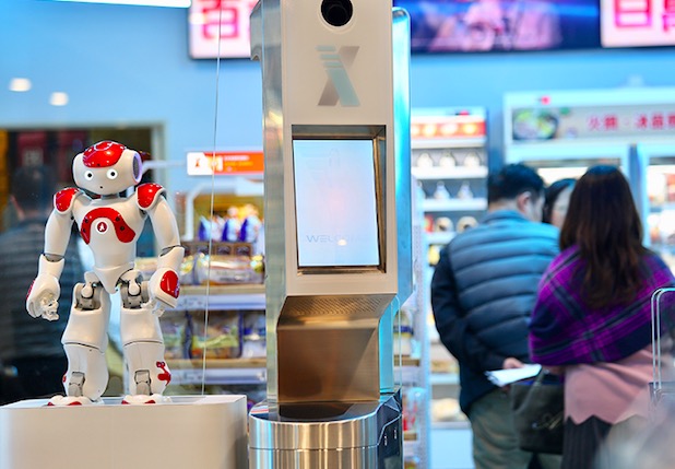 在这个面积约60平方米的空间里,除脸部识别、RFID标签、自助收银等无人便利店的最基本配置外,还增设了只要有人靠近就会自动开启的冰箱感应门;自助鲜食区的扫描式微波炉,实现了只要将商品条码置於微波炉感应器下,就可以自动辨别微波时间,顾客无需操作时间按钮;出现在店里的机器人,则会主动跟客人说“欢迎光临”。