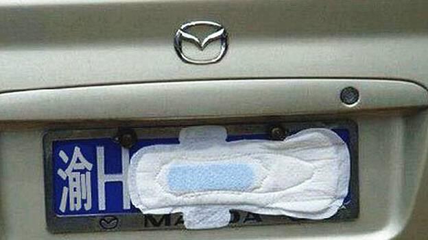 很多男士把爱车当做媳妇,当然要配上性感的蕾丝内裤。其实使用女性用品遮挡车牌的人不在少数,每一位都十分有才。