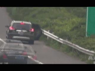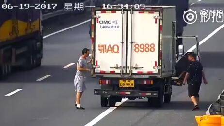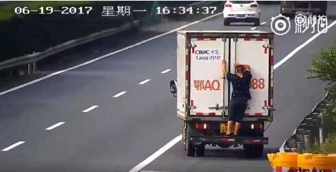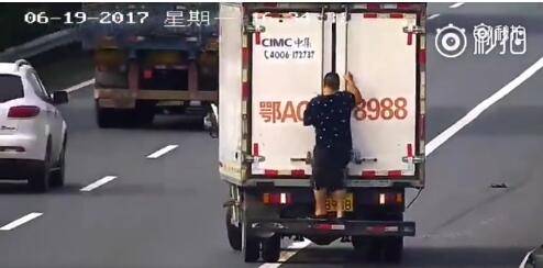 这位大货车副驾驶员在高速上上演了一场杂技。站在保险杠上,小腿遮挡住号牌,上半身遮住车厢上的放大号。