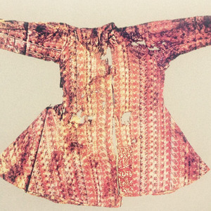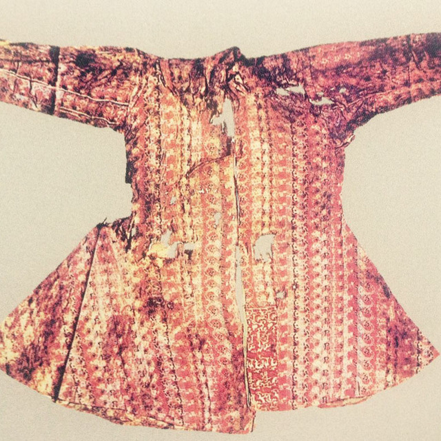 1959年秋天,新疆维吾尔自治区博物馆李遇春带领克尤木·霍迦、艾合买提、托尔逊、阿吉等考古队员,带着馕、面粉、装了水的铁桶,离开了民丰县城,往北向尼雅沙漠走去。这是一个十分年轻的考古队伍,他们在尼雅遗址清理了10处房屋,发现了近千件文物标本。他们最大的收获是发现了东汉时期精绝贵族夫妻合葬墓,这件“万世如意”铭文锦袍出土时就穿着于深目高鼻的人身上,而且保存较好,其款式具有西域胡服特征,色彩图案中原特色明显,像这样如此奇特的服装在内地是十分少见的,因而显得非常珍贵,其学术、文化艺术价值很高,可以称得上新疆维吾尔自治区博物馆的镇馆之宝。