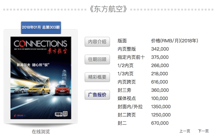 “强制阅读,平均1.5小时乘坐时间,(对品牌而言)有很高的接触机会。“一位从事2年航空刊物广告销售的业内人士解释说。在他看来,广告商看中的正是航空公司庞大的优质客群以及航线的覆盖范围,过去几年,他所在公司还会偶尔上调刊例价。