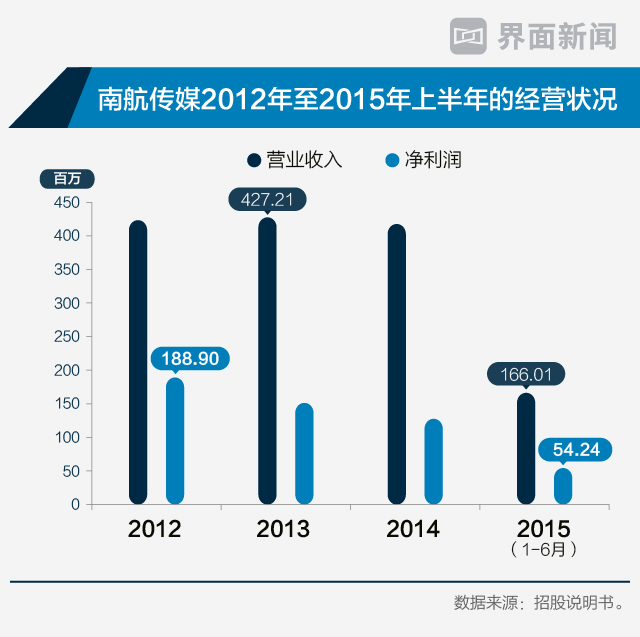 根据证监会官网上公布的招股说明书,2015年上半年,中国南航集团文化传媒股份有限公司(以下简称“南航传媒”)的营业收入达到1.66亿元,但是净利润超过5400万,主营业务毛利率高达54.6%,净利率更是高达32%,2012年的净利率更是达到惊人的44%;相比之下,靠卖机票赚钱的南方航空(SH.600029),2016年的净利润虽然超过50亿元,但是净利率只有4.4%。