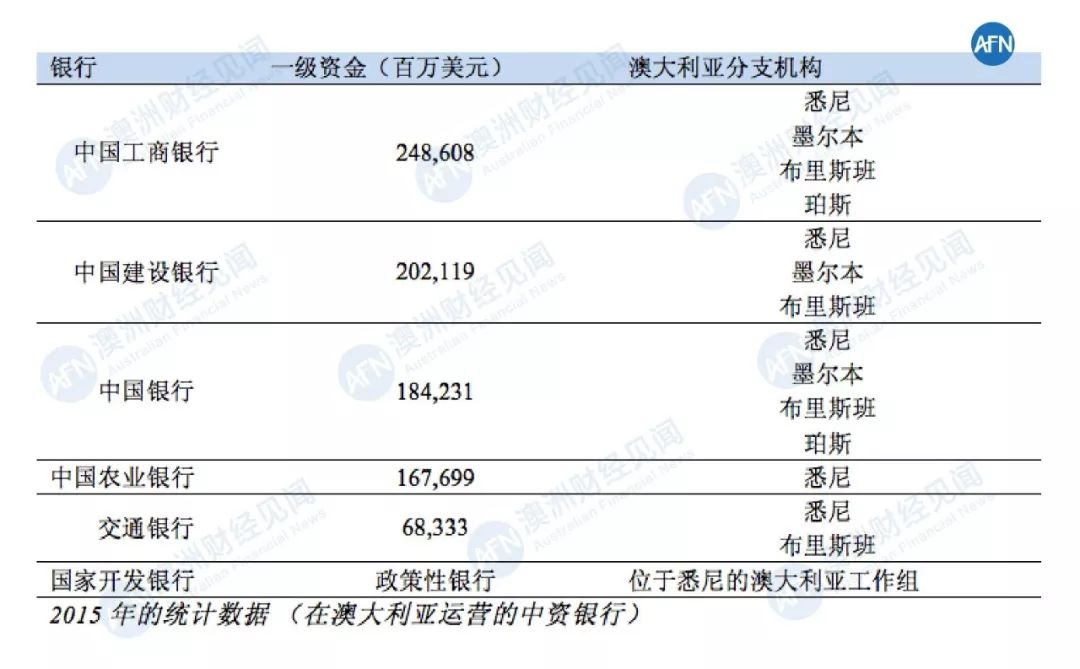 中资银行—在过去的十年中,所有主要国有控股的商业银行都已在澳大利亚开设分行,由中国投资者来澳洲投资所驱使。(客户由中国投资者组成)提供金融服务。一般来说,在澳大利亚运营的这些中资银行主要依赖于他们的能源资源类客户。