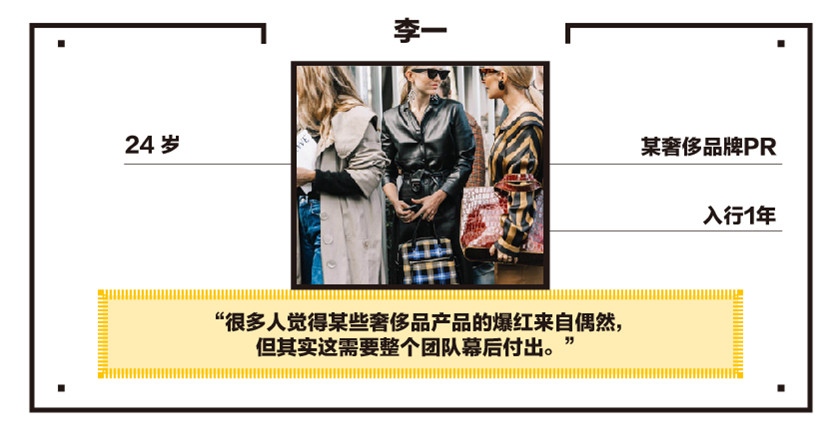 另外,奢侈品行业的工作真的比较辛苦。以我的工作来说,在每季时装周结束到那一季款式到店上架的中间几个月时间,我们得通过联系杂志拍摄 、线上线下的活动、投放广告等等来提升产品的受欢迎度,改变消费者的态度,特别是新设计反响一般的时候。但这也让人非常有成就感。可能有人觉得产品的爆红来自于偶然,但其实这是整个团队幕后付出的结果。