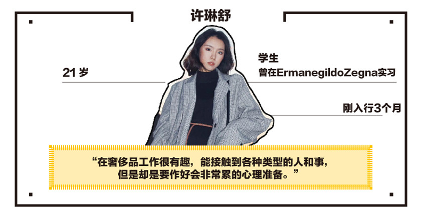 我是学服装设计专业的,身边人说我可能比较适合在奢侈品牌工作,所以我就拿着简历一家一家奢侈品店去问,最后只有Ermanegildo Zegna在招实习生。可能也是由于他们当时缺少人手,我英语又比较好,性格也算开朗,所以问了我几个简单的问题就给了我这份工作机会。