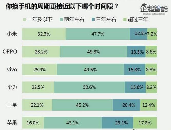 在品牌上,小米更是处境尴尬。由于长期以来用性价比来赢得销量,让小米的品牌贴上了低价标签,虽然年轻人的第一部手机可能是小米,但是一旦他们收入增长,消费升级,他们迫不及待地就是要换掉小米,改用高端品牌。去年企鹅智酷的一份中国手机用户消费报告显示,小米用户更换手机的频率最高,一年一换的用户占比达到32.3%。小米一直在谋求品牌升级,但是因为上述的产品、技术问题,无法真正如愿。