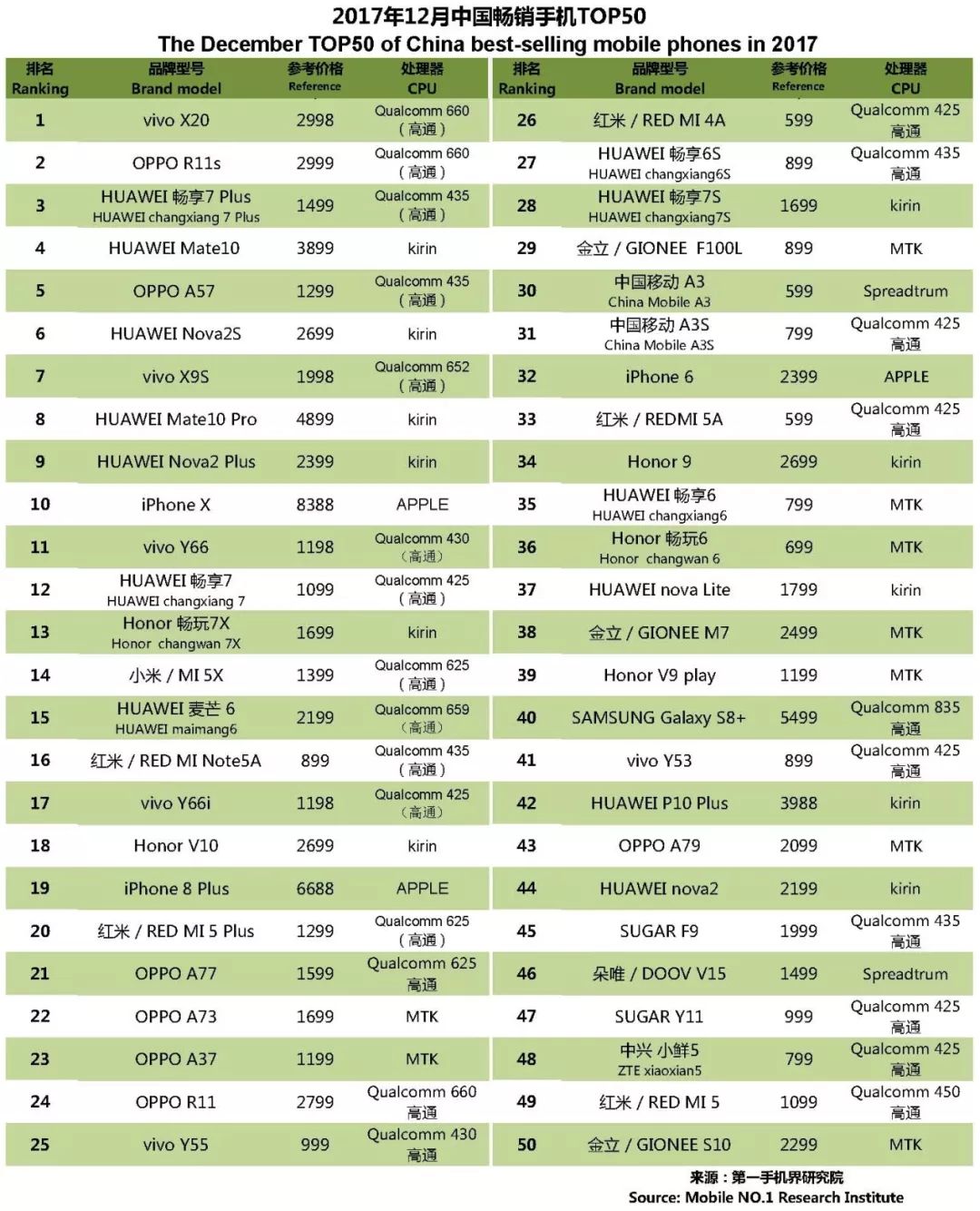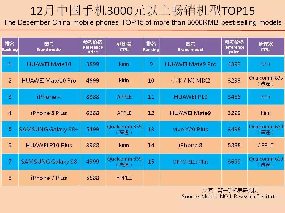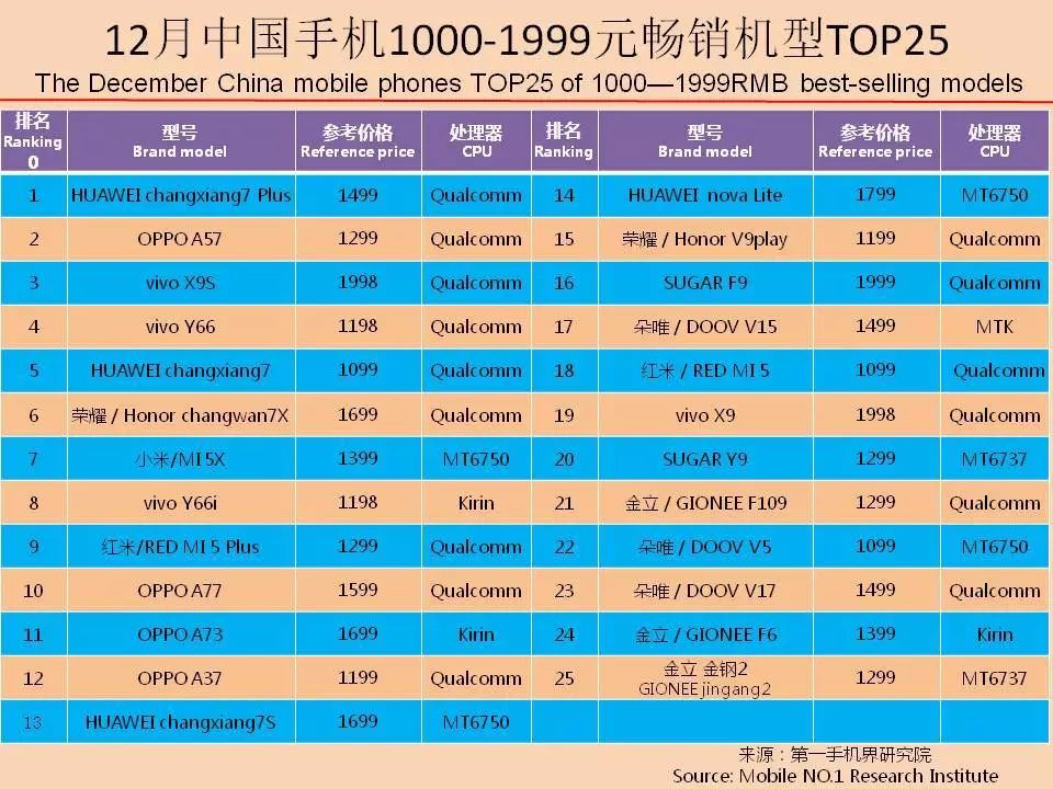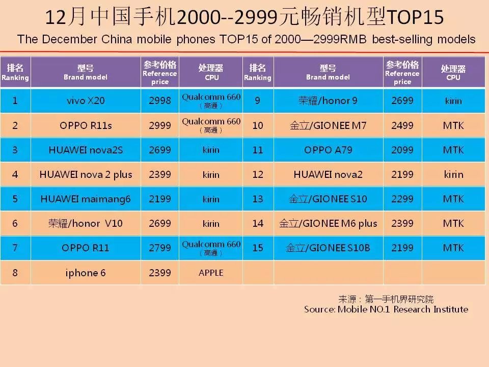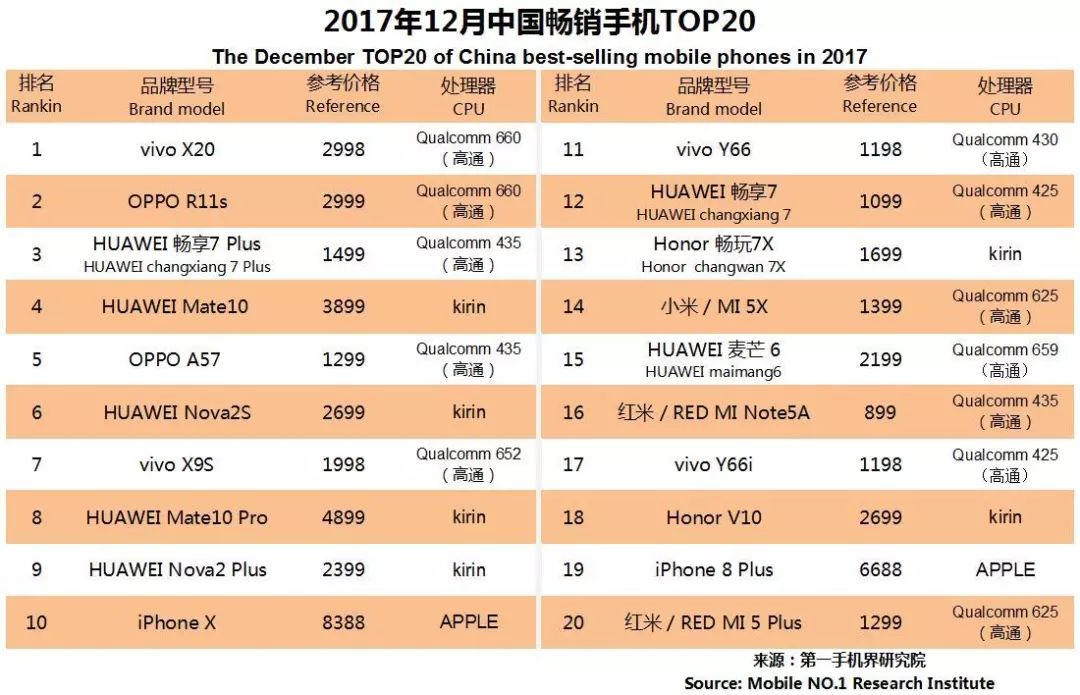 vivo X20、OPPO R11s、华为 畅享7 Plus、华为 Mate10、OPPO A57、华为 nova2S、vivo X9S、华为 Mate10 Pro、华为 nova2 Plus、iPhone X成为12月中国畅销手机TOP 10。