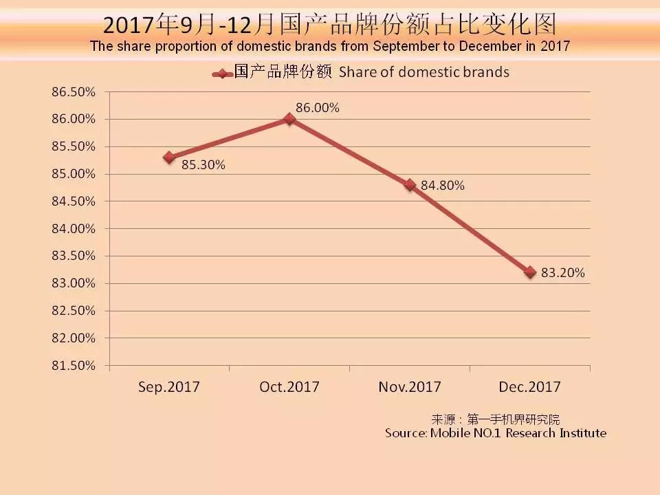 由于iPhone X销量暂时可观,加上三星在高端手机市场略有回暖拉动了国际品牌手机在中国市场上的占有率的上升,达到了16.8%。