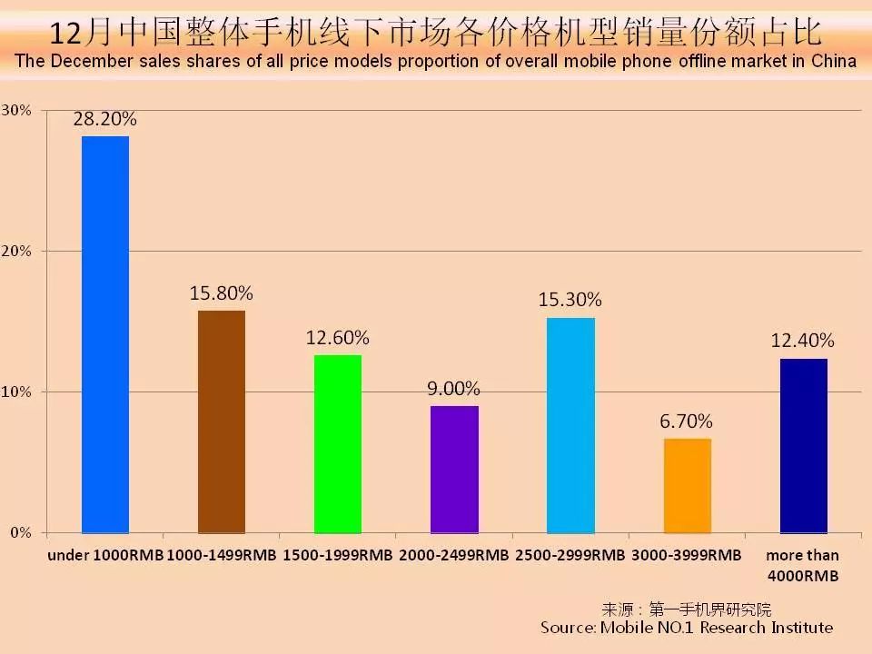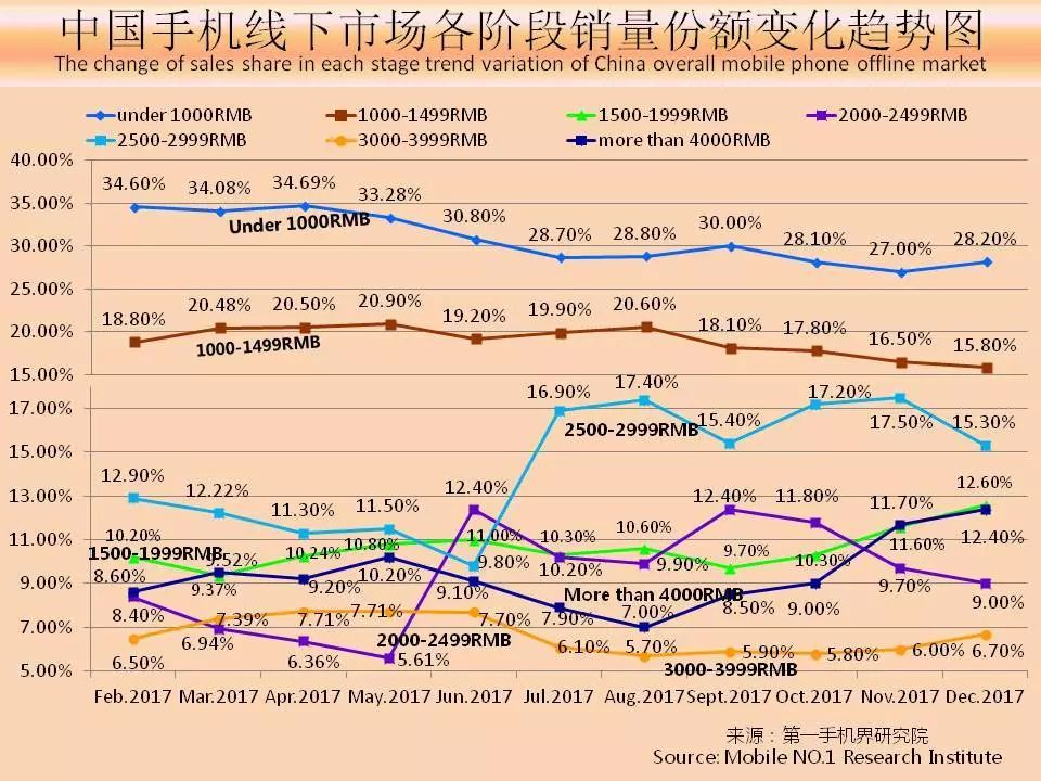 从中国手机线下市场各价格段销量份额变化趋势图可以看出,4000元以上的手机市场份额趋势还在持续走低,历史最高似乎还在“明天”。