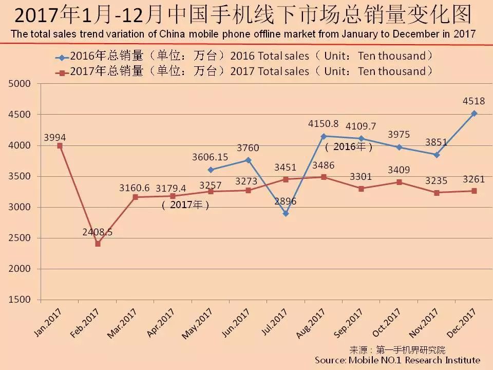 第一手机界研究院根据覆盖全国25个省/直辖市/自治区221个城市,10034家线下手机实体店的销售数据统计结果计算,2017年12月中国大陆整体手机线下市场共完成销量3261万台,同比减少27.8%,环比11月增长了0.8%。