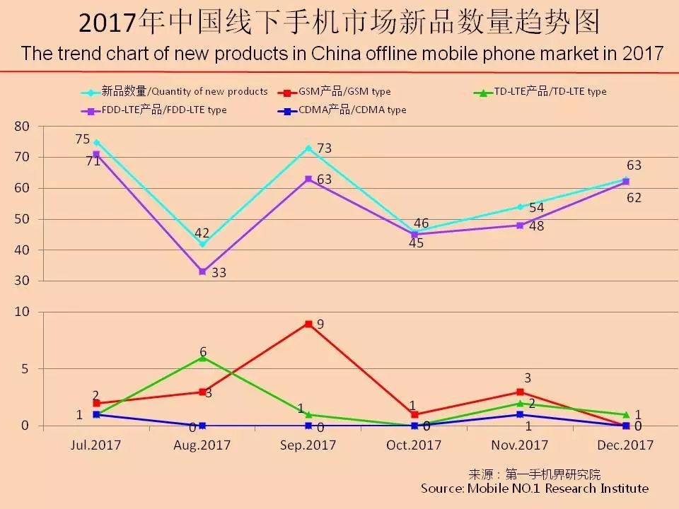 2017年12月,中国大陆手机线下市场共有63款新品推出,1款TD-LTE和62款FDD-LTE产品。