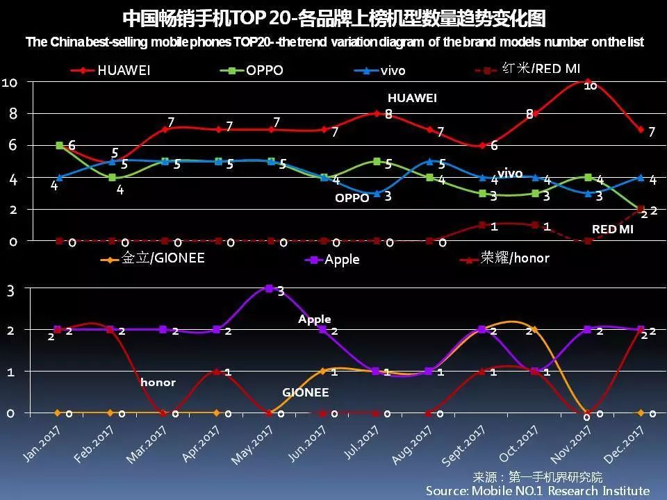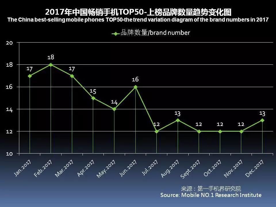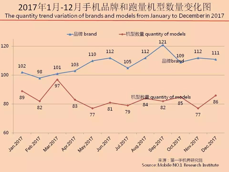 根据七星手机连锁、话机世界、广西王者通讯、四川龙翔通讯、广东丽的通讯、广东新星源手机数码连锁、黑龙江省凌志手机连锁、海南王者天创、山西太通科技、山西远大通讯、湖南齐欣通讯、江西丽华通讯、湖北九鼎通讯、吉林天天手机、云南九机网、甘肃悦达、陕西中人、河南兄弟通讯商会、河南国宇、河南胜天、江苏国网、河北润德、厦门中桥、迪信通、贵州诚讯、华伟通讯、大地通讯、重庆祥佳音、河北国通等全国手机连锁卖场销售数据统计结果显示,2017年12月在中国线下渠道销售的手机品牌达到111个,环比11月112个,减少了1个;12月有一定销量的手机机型达到86款,环比11月77款,增加了9款。