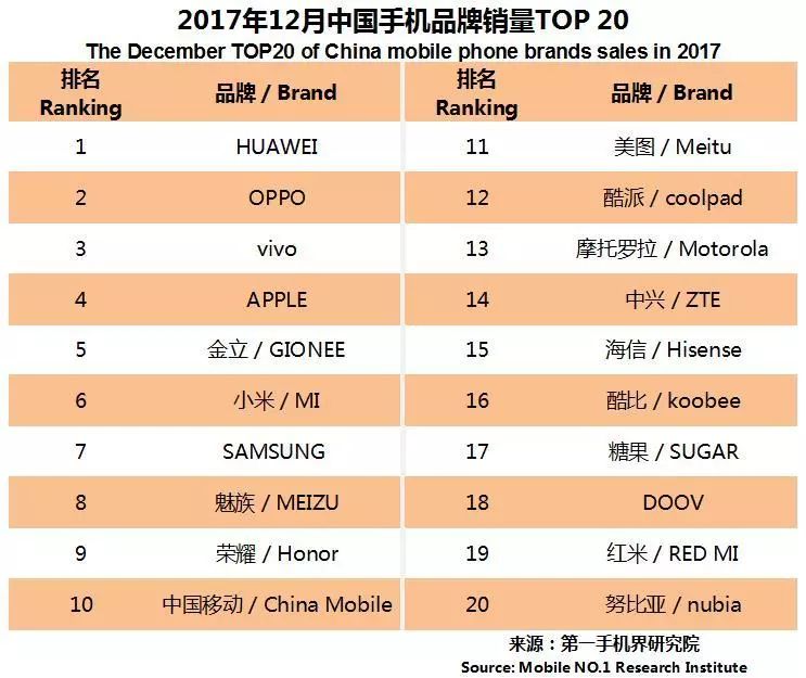 2017年12月中国手机品牌销量TOP 20