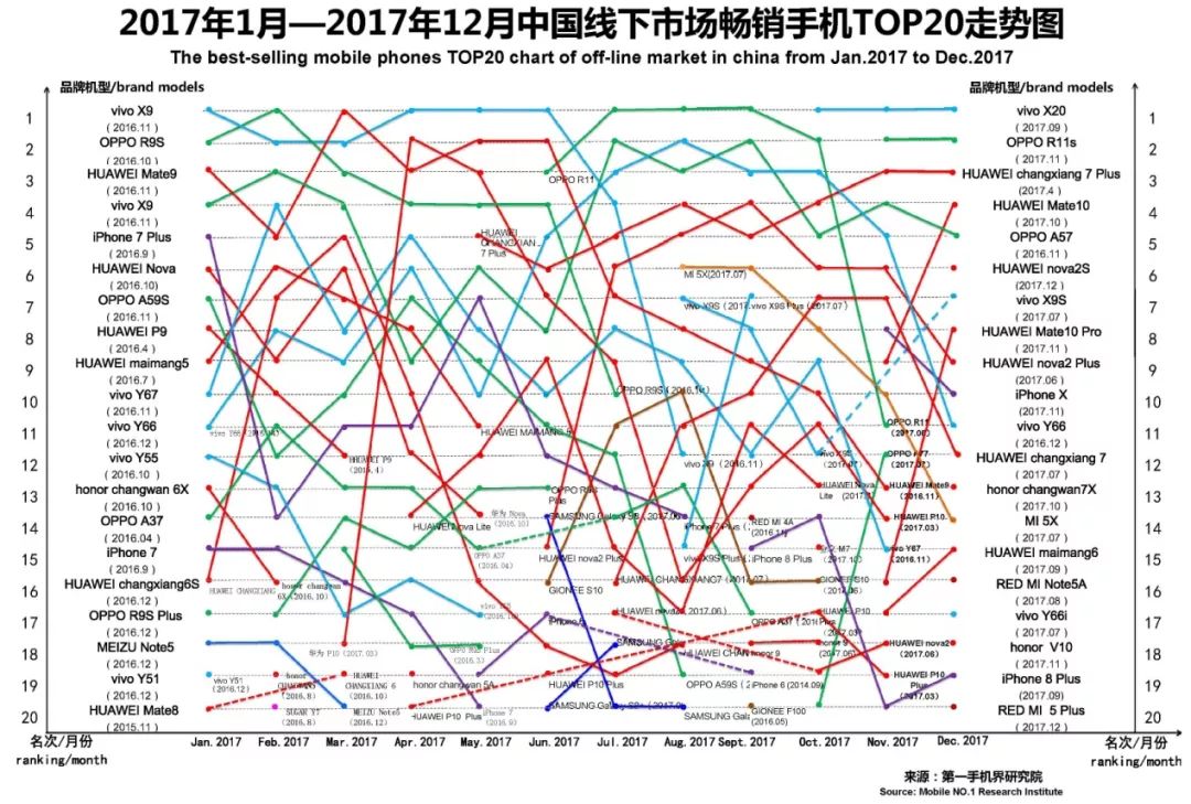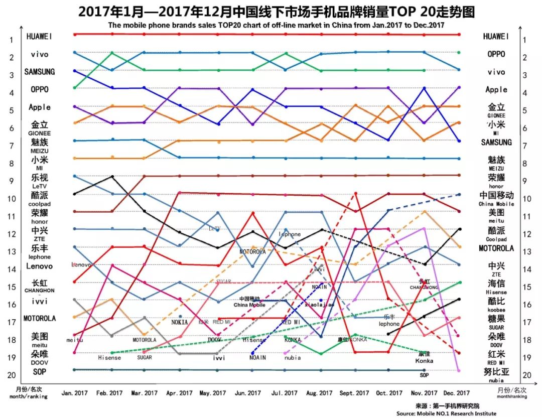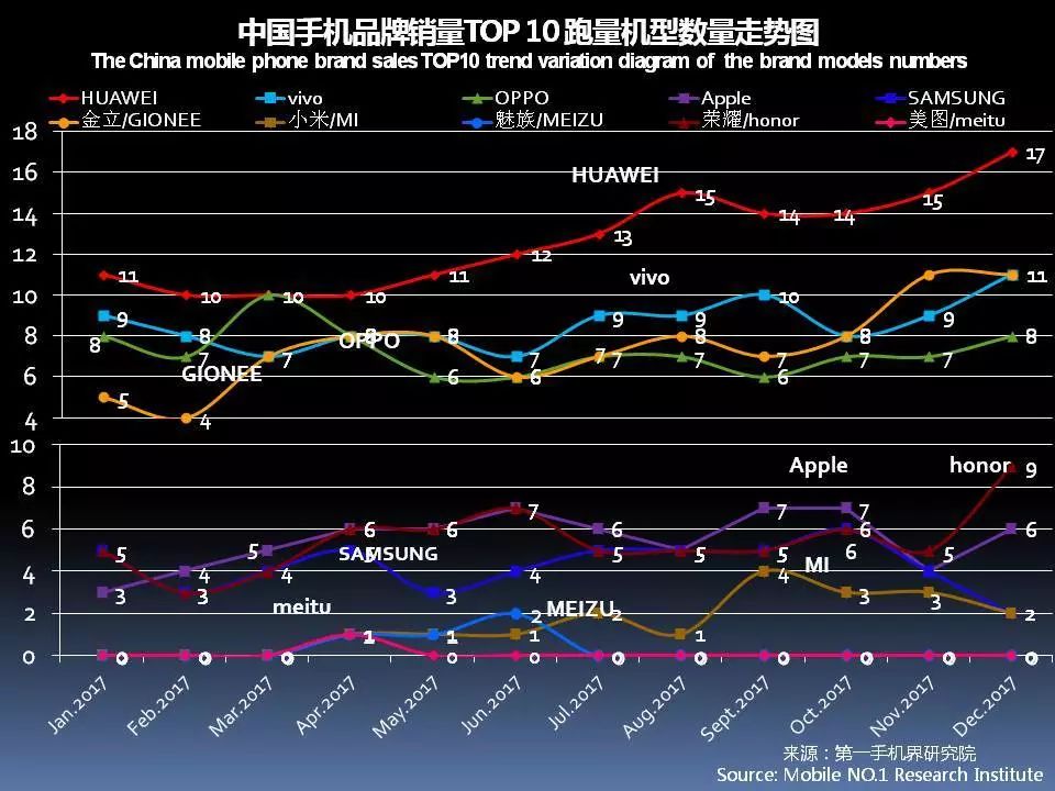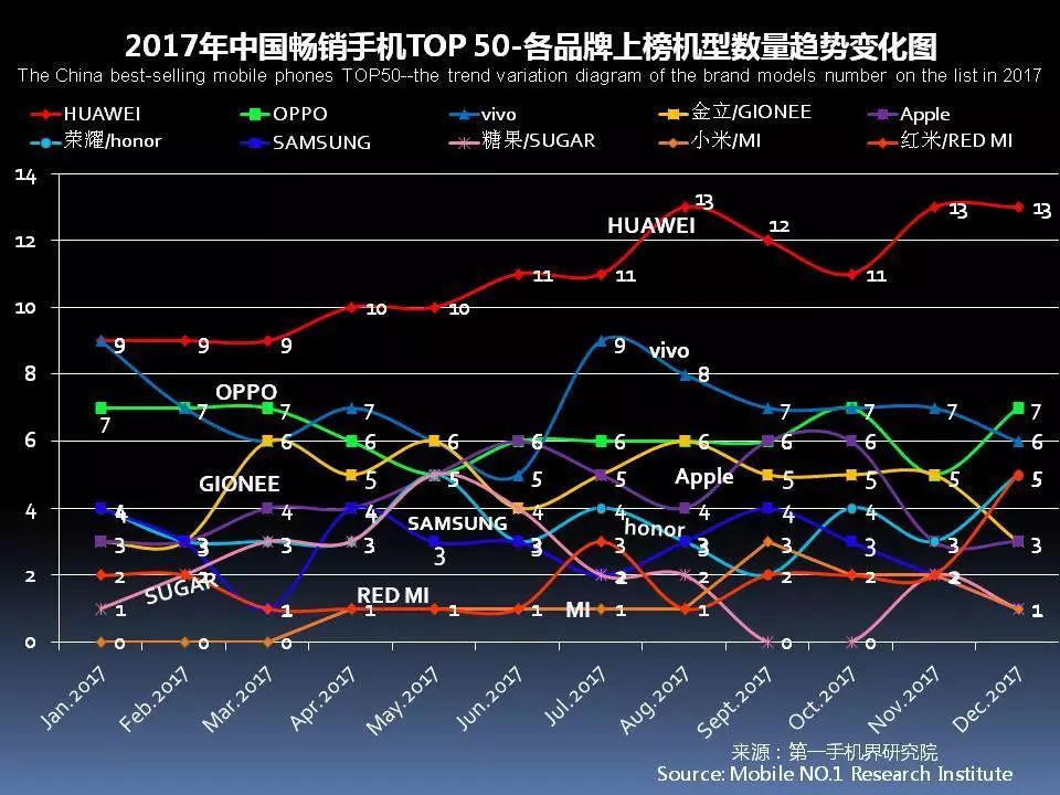 2017年12月在中国大陆线下渠道走量的手机机型基本分布是,华为 17款、金立11款、vivo11款、荣耀9款、OPPO 8款、苹果6款、红米5款、SUGAR糖果手机3款、朵唯3款、三星、小米2款和中国移动各2款、中兴、红辣椒、卡布奇诺、青橙、华岷、百合、丰迅达各1款。